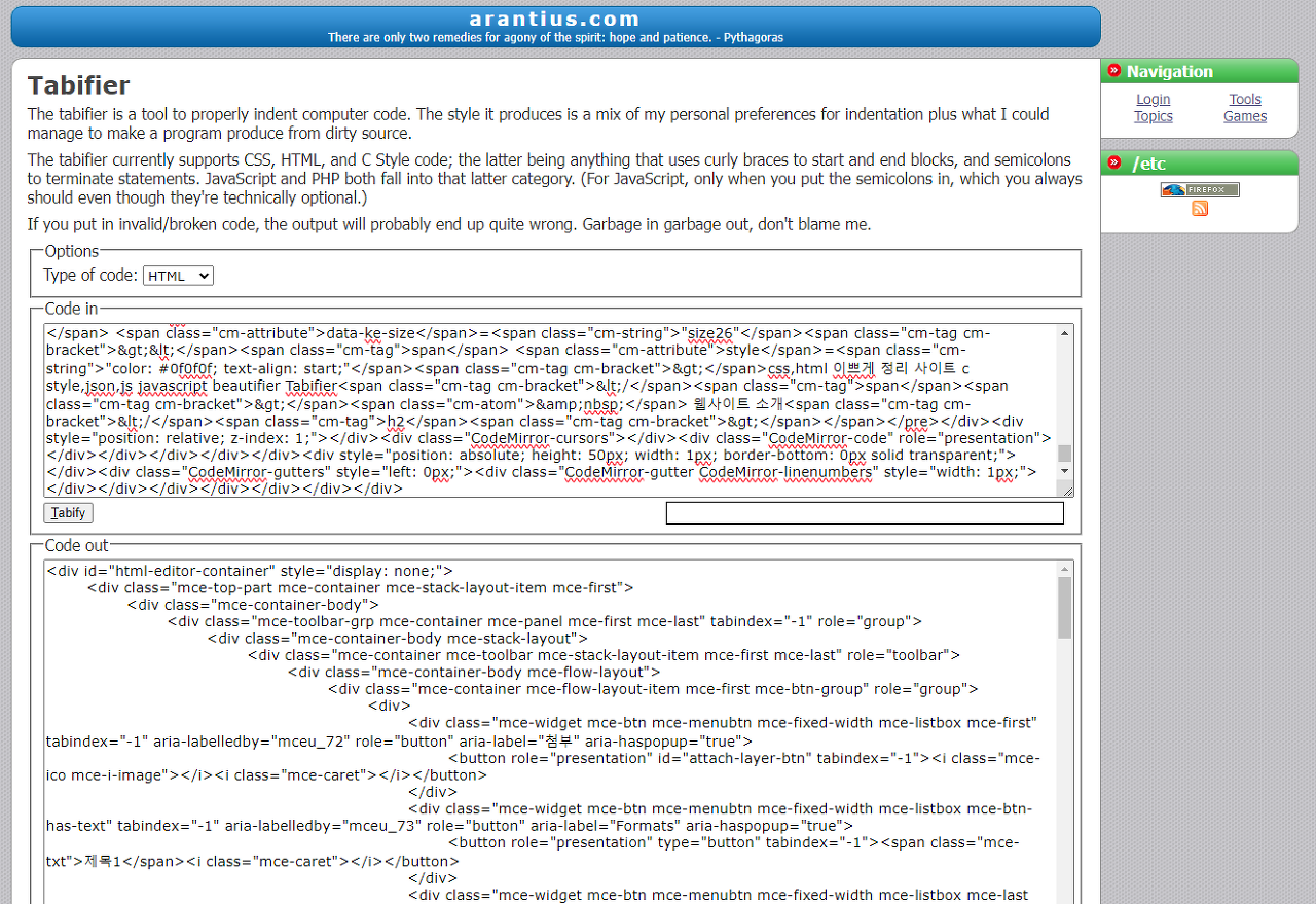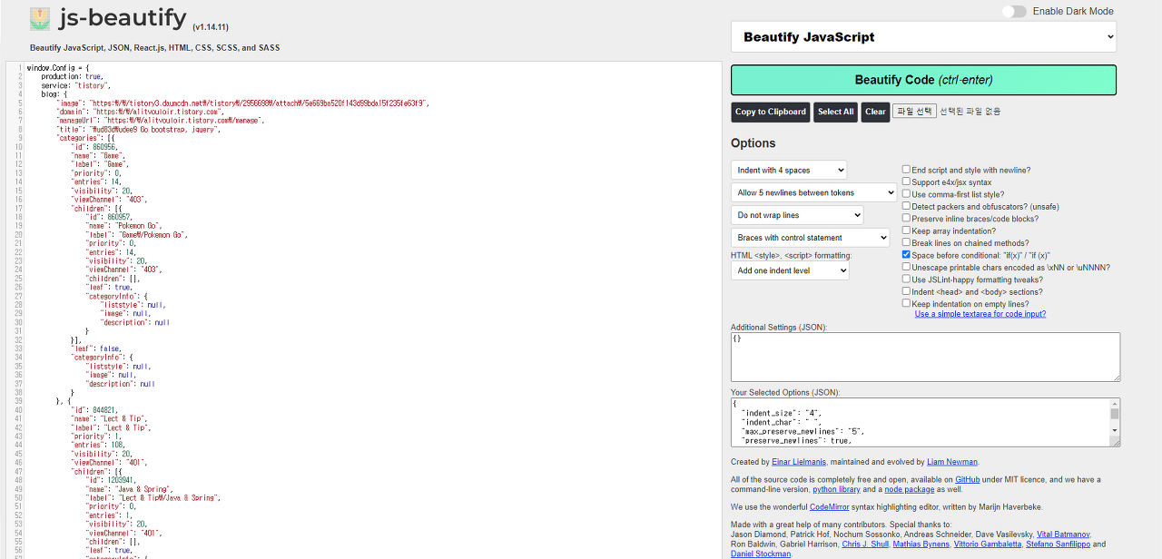 css, html 코드 정리 사이트 c style, json, js javascript beautifier Tabifier